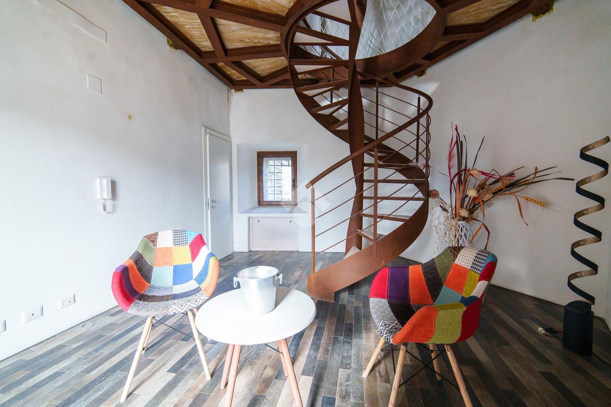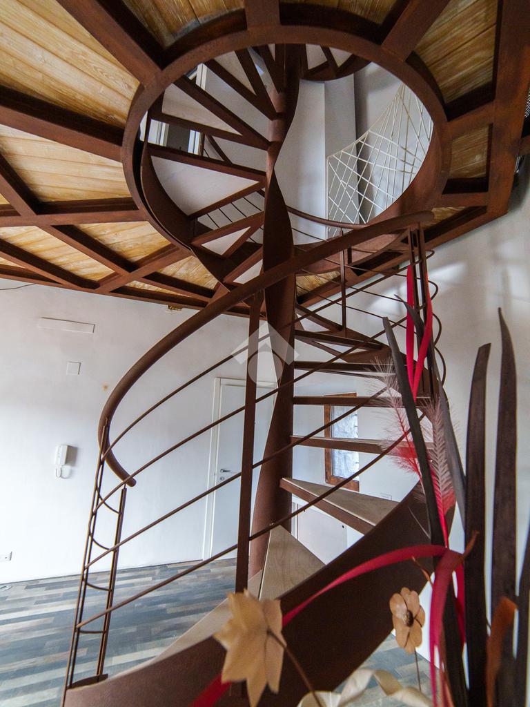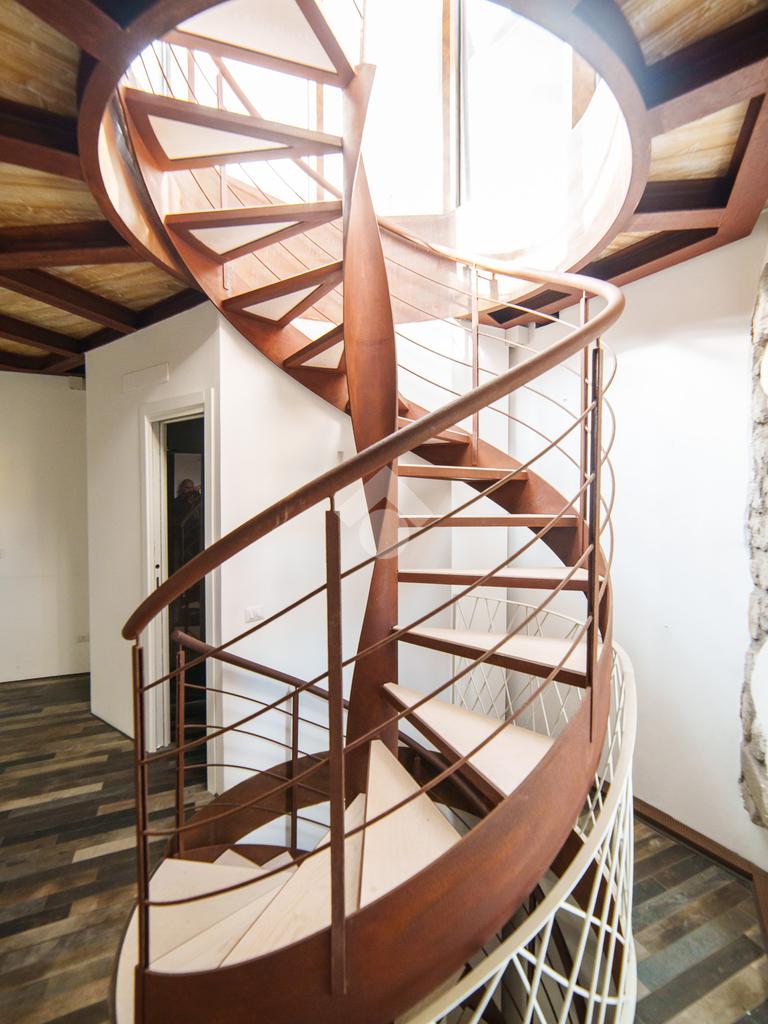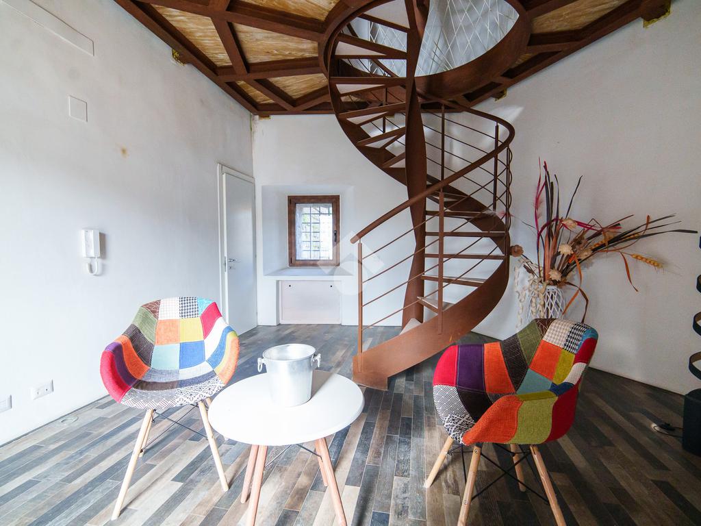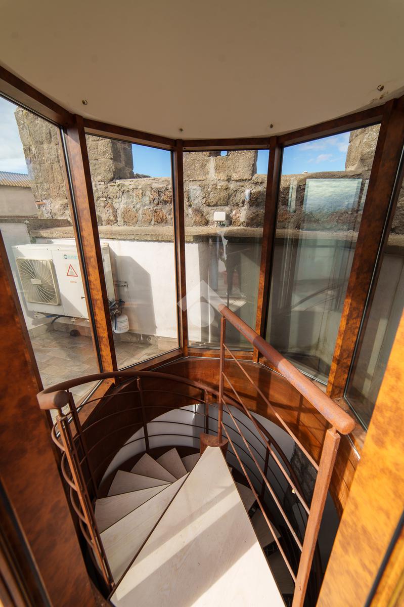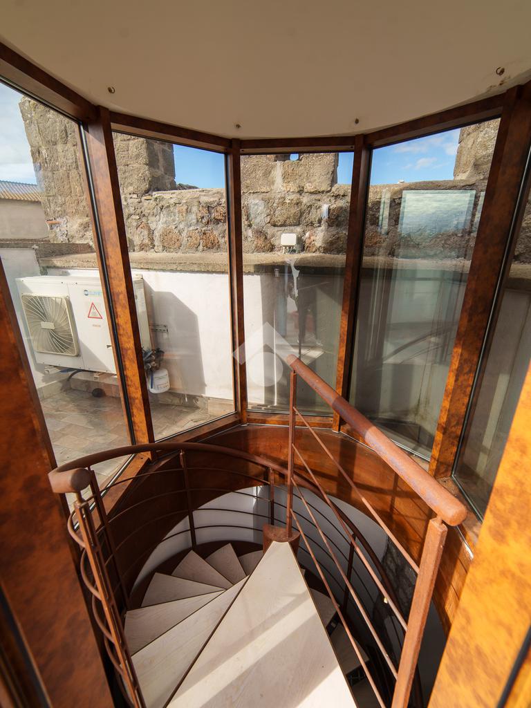 La torre si sviluppa su tre livelli collegati da una scenografica scala a chiocciola in ferro e legno, elemento centrale della casa, e si completa con una splendida terrazza panoramica all’ultimo piano. Da qui, lo sguardo si apre sul centro storico di Viterbo, regalando momenti di quiete e bellezza a ogni ora del giorno.