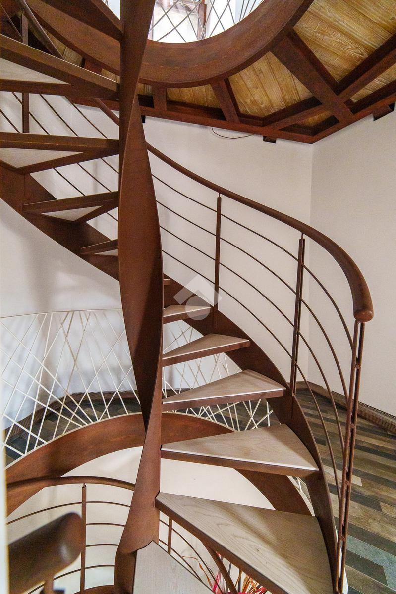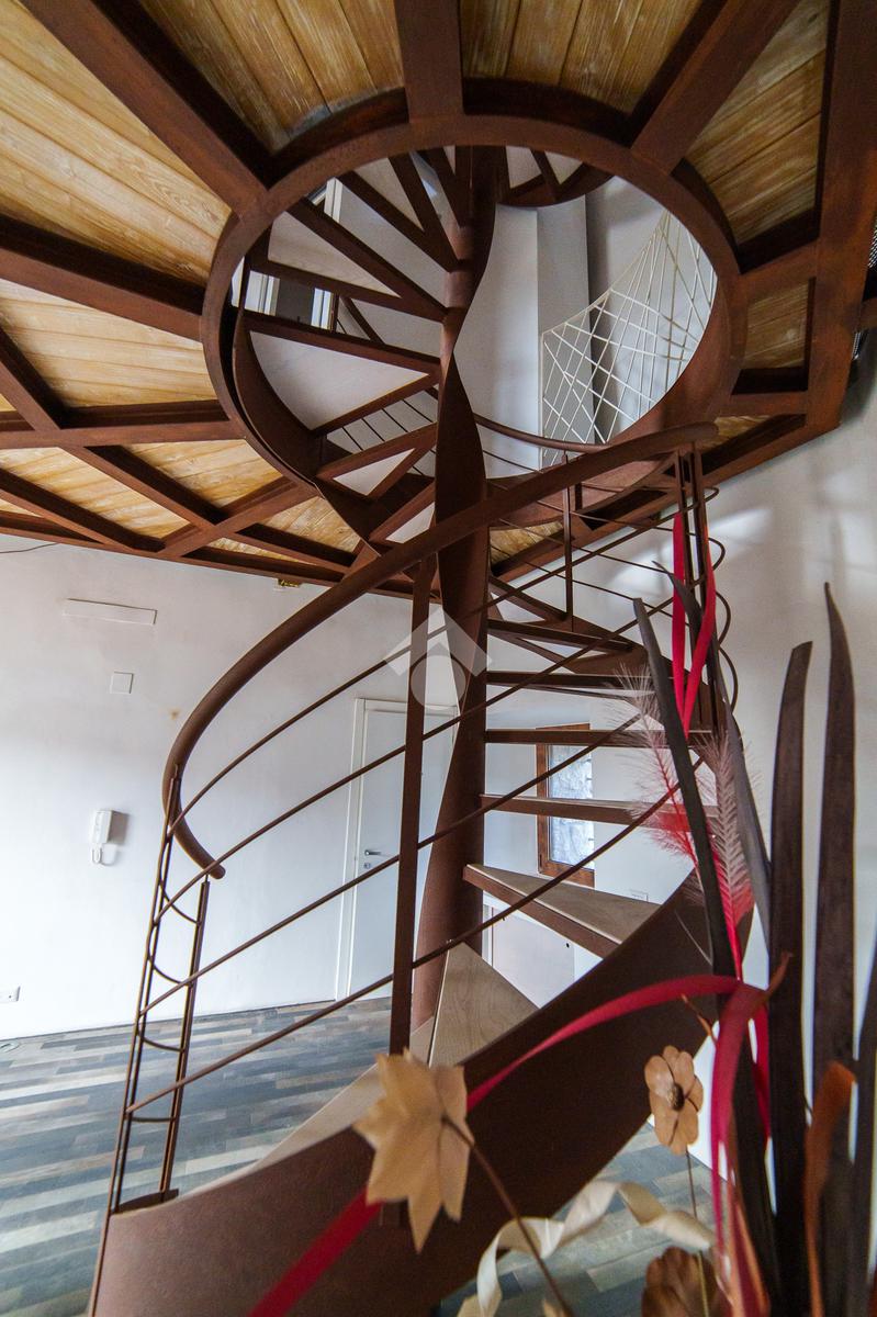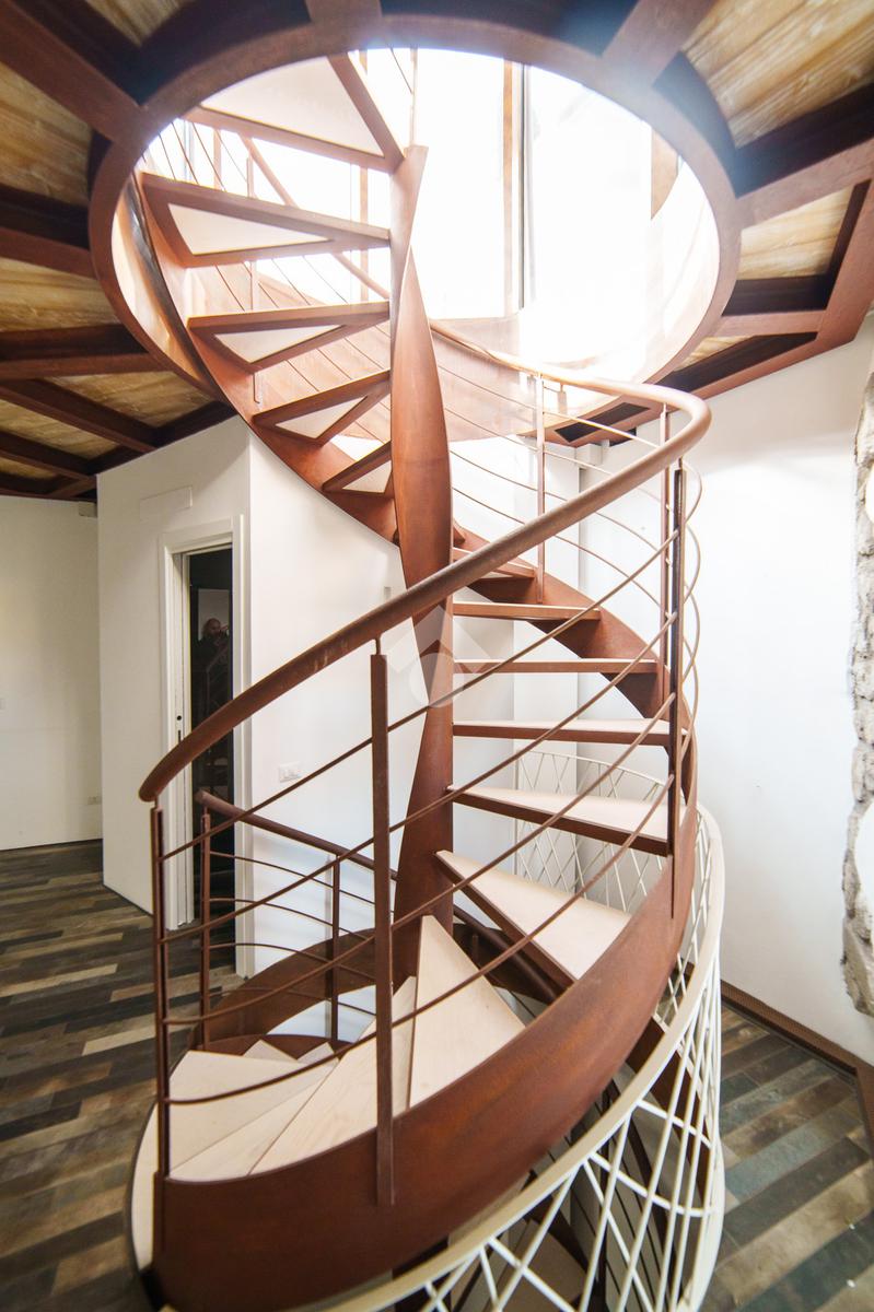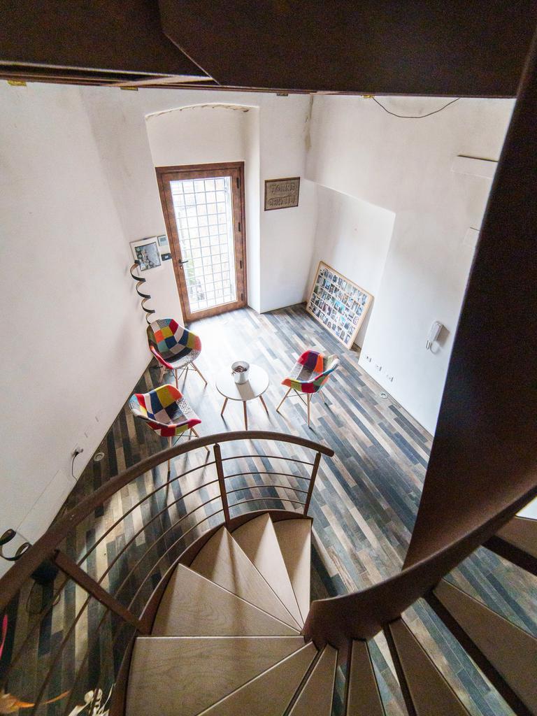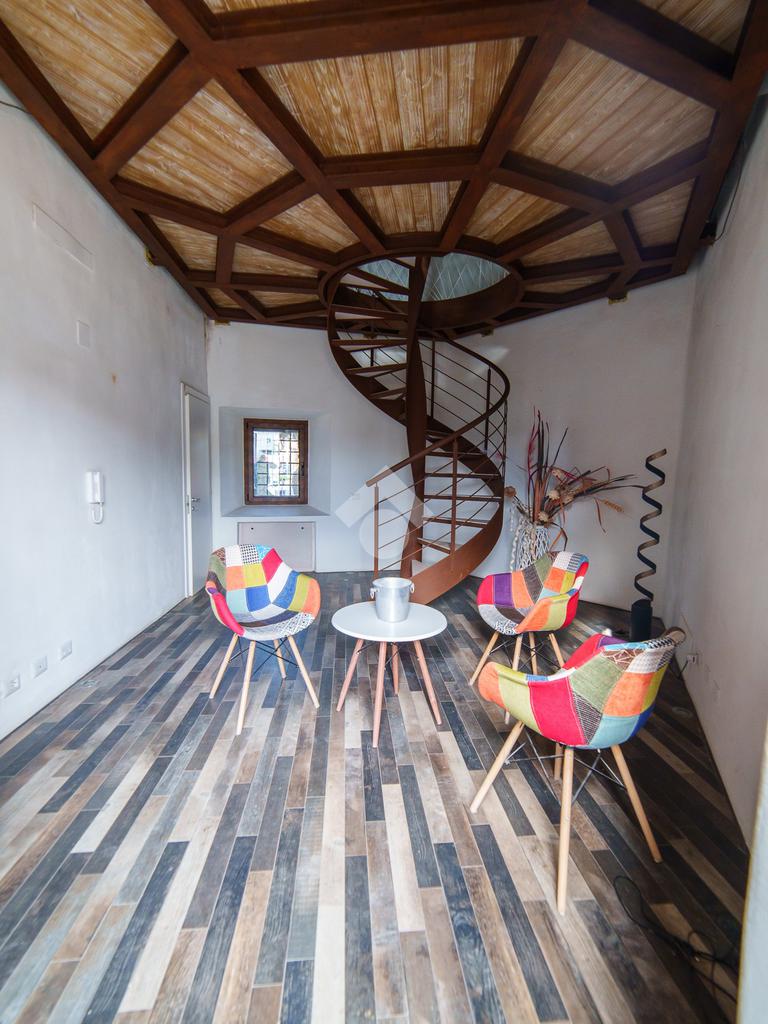 La torre si sviluppa su tre livelli collegati da una scenografica scala a chiocciola in ferro e legno, elemento centrale della casa, e si completa con una splendida terrazza panoramica all’ultimo piano. Da qui, lo sguardo si apre sul centro storico di Viterbo, regalando momenti di quiete e bellezza a ogni ora del giorno.
